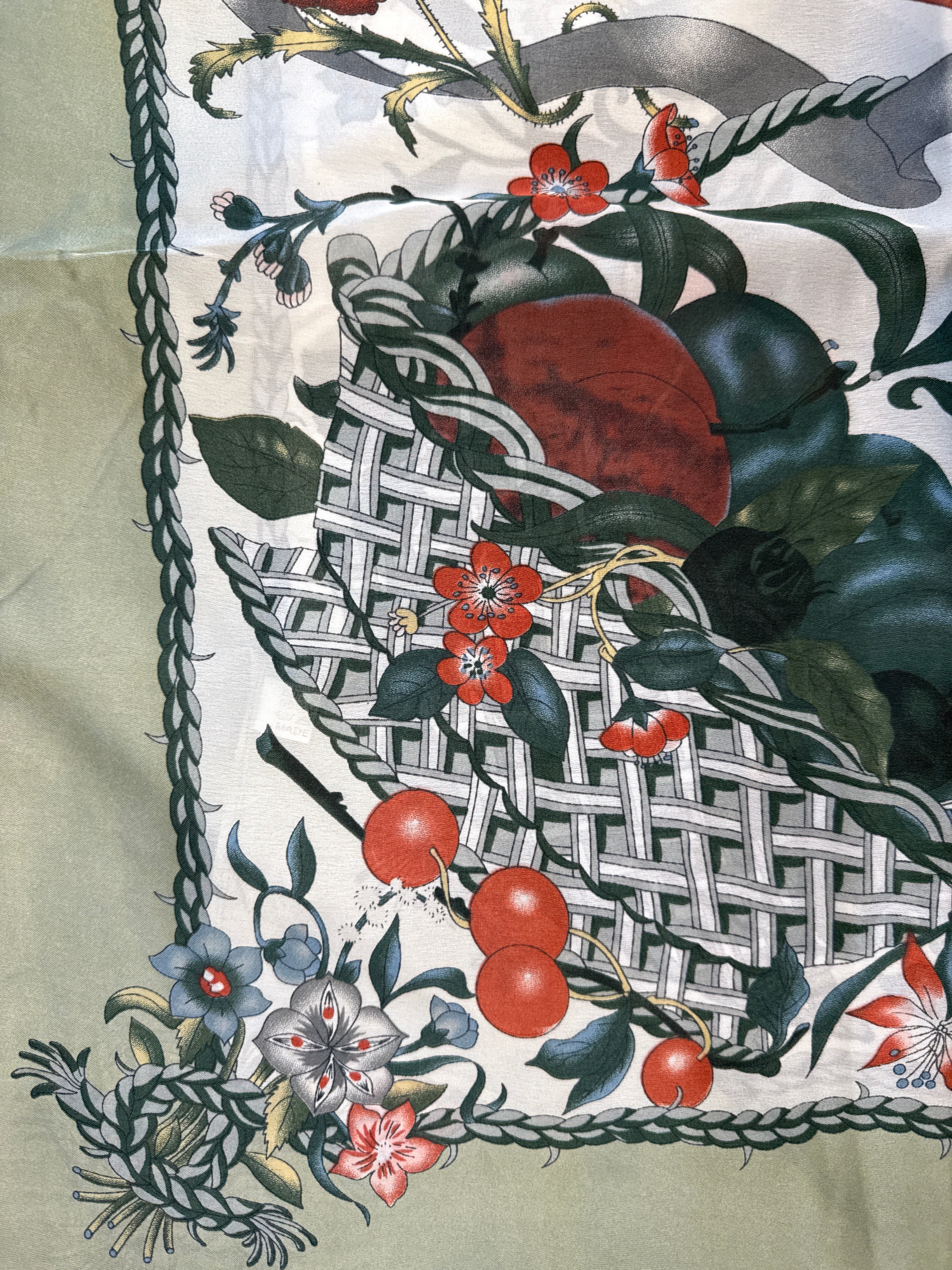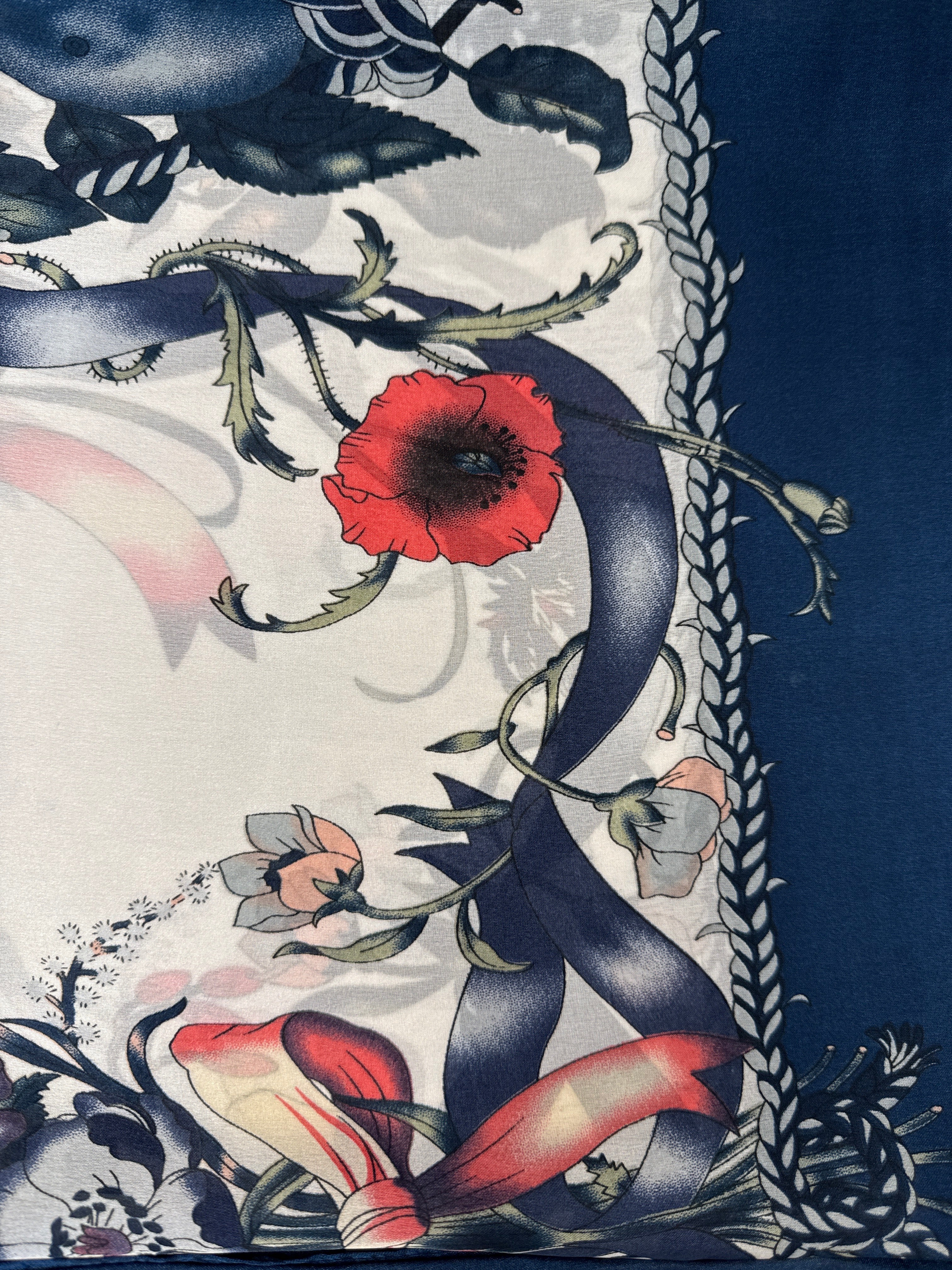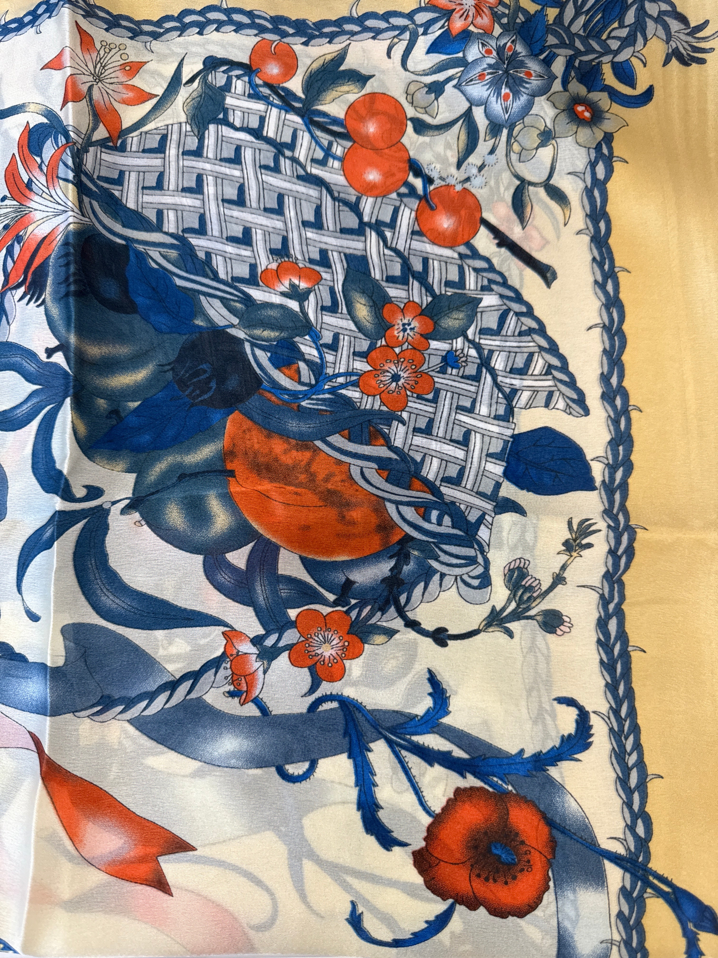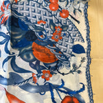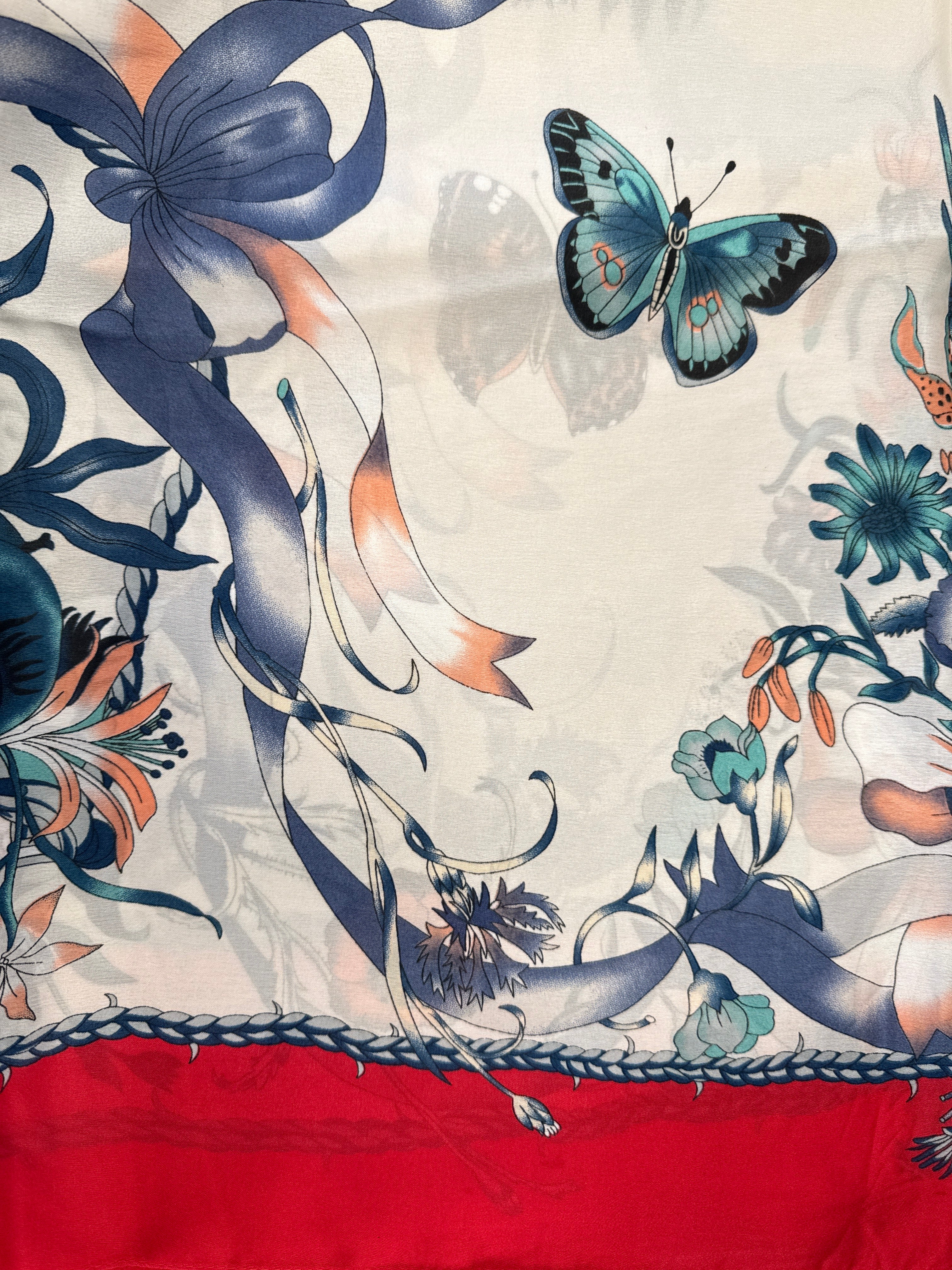 This luxurious silk scarf features a beautiful butterfly and flowers design in vibrant colors on a soft, elegant background. Available in multiple colors to suit your style, it adds a touch of sophistication and artistry to any outfit.