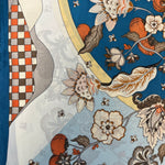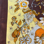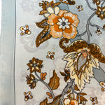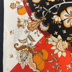 A luxurious floral pattern featuring intricate flowers, leaves, and branches in warm shades. The detailed design exudes a sophisticated autumn vibe, perfect for a stylish accessory like a scarf or handkerchief.