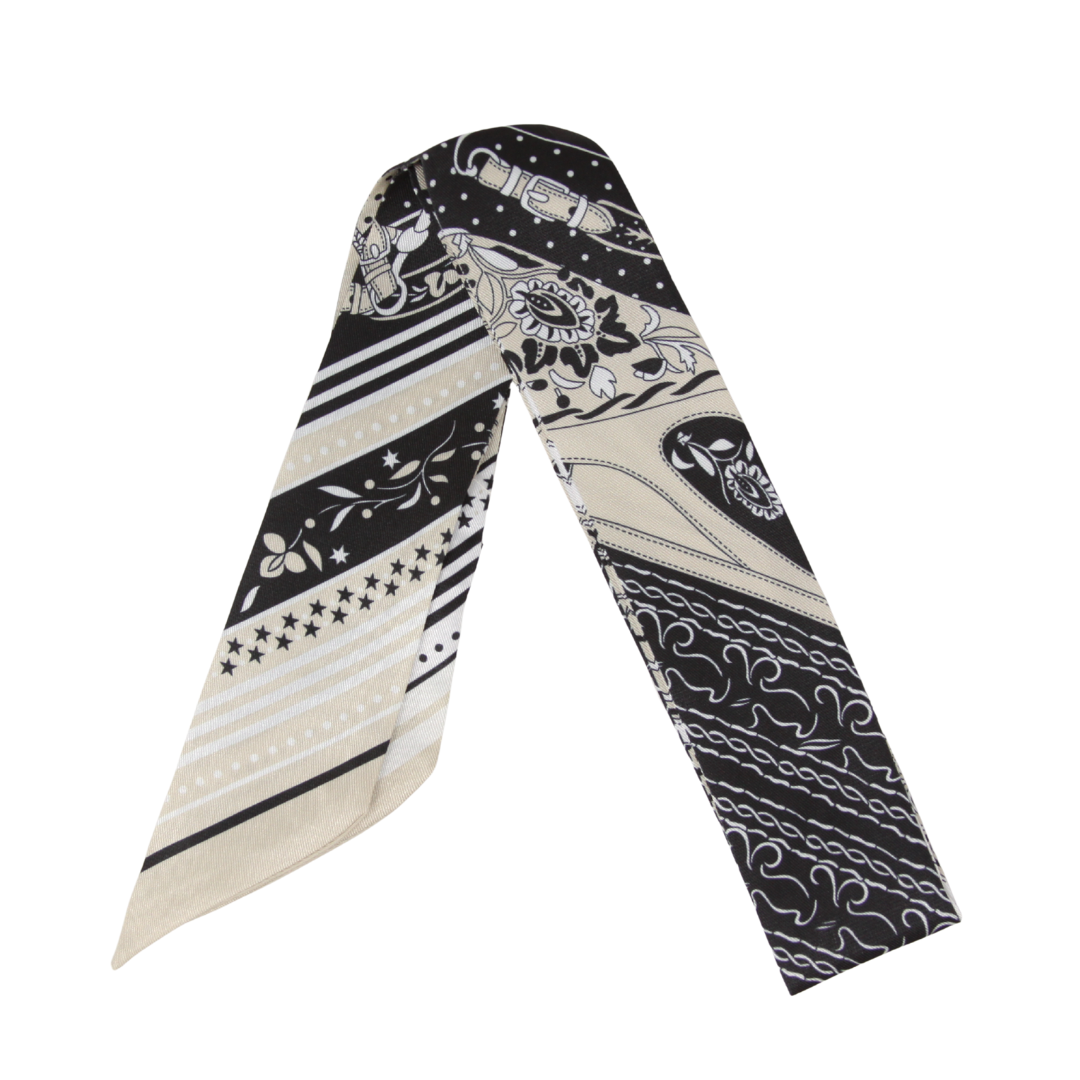 This YF08-T14 skinny silk scarf features a detailed print of saddles and equestrian gear, combining classic equestrian style with elegant design. It can be used for decorating handbags, small neck scarves, ties, satin ribbon scarves, skinny head scarves, hairband scarves, ponytail scarves, purse wraps, and headbands.