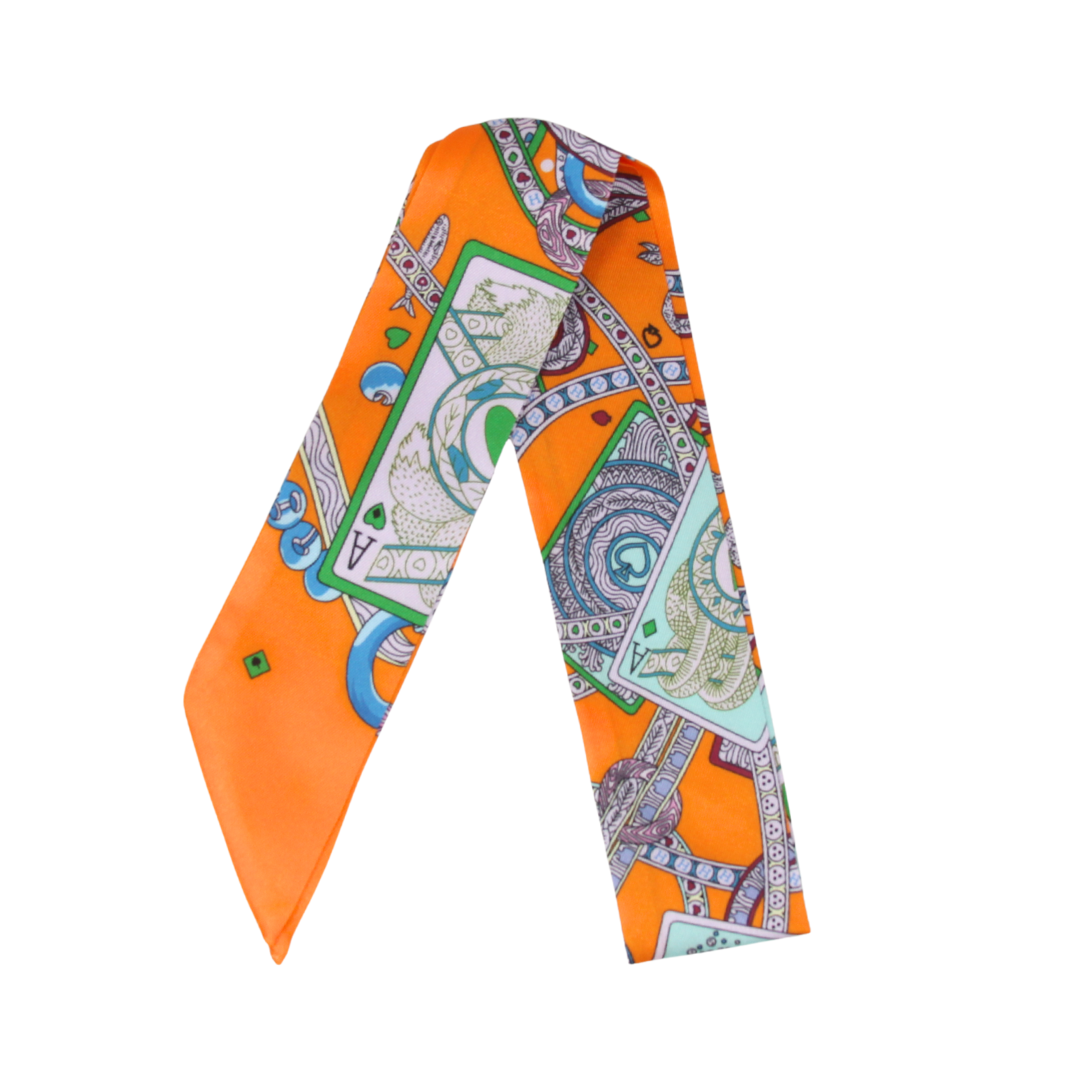 The scarf features a playful playing card pattern, with a design that includes illustrations of the Queen of Hearts. It can be used for decorating handbags, small neck scarves, ties, satin ribbon scarves, skinny head scarves, hairband scarves, ponytail scarves, purse wraps, and headbands.