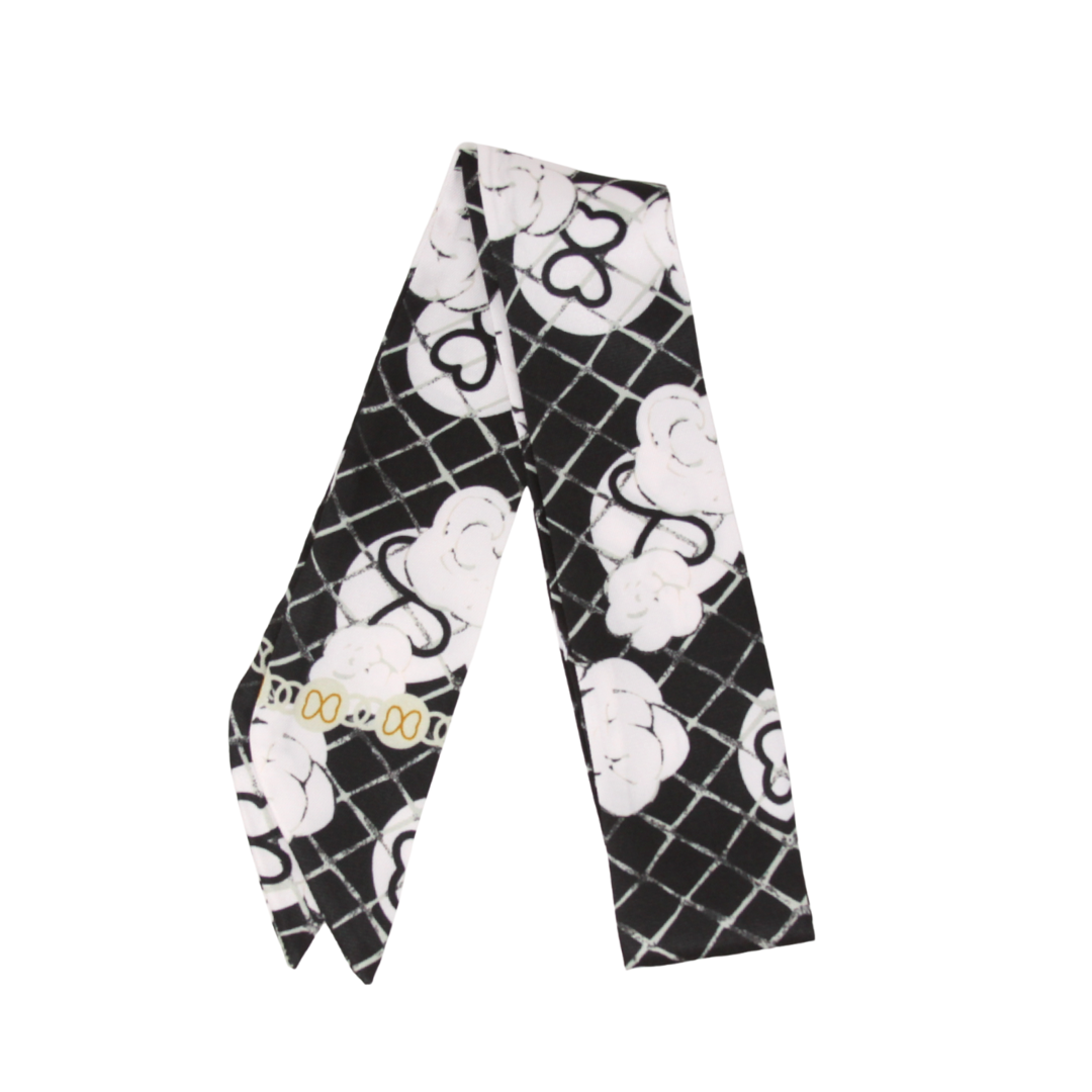 This elegant, skinny silk scarf features a delicate camellia flower design combined with a classic quilted pattern, adding a refined touch to any outfit. It can be used for decorating handbags, small neck scarves, ties, satin ribbon scarves, skinny head scarves, hairband scarves, ponytail scarves, purse wraps, and headbands.