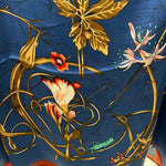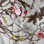 This scarf features a delicate floral and vine pattern accented with a variety of colored flowers, adding a touch of elegance to any outfit. Its design combines softness and vibrant hues, making it a versatile accessory for both casual and formal wear.
