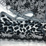 This mid-size scarf combines bold leopard print with delicate lace-like patterns and refined equestrian motifs such as buckles and chains. Its unique design merges wild and classic elements, making it a versatile accessory to elevate various outfits with a touch of sophistication and edge.
